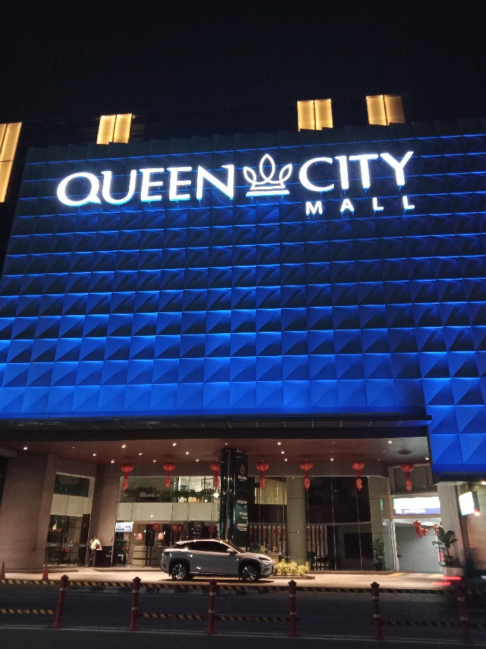 This image captures the illuminated exterior of Queen City Mall in Semarang, Indonesia, at night