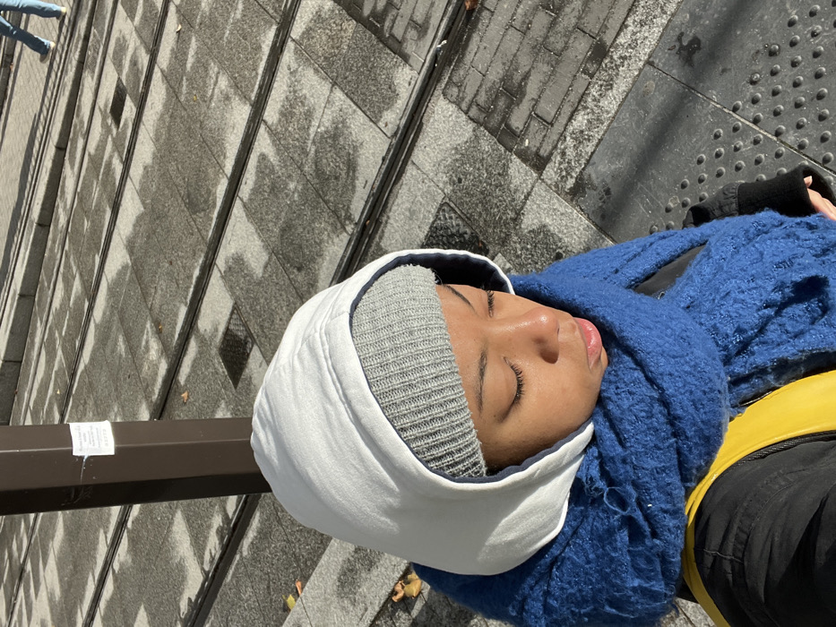 A young woman in a gray knit cap with a white hood, and a blue wool scarf, lies against a gray-tiled sidewalk. Sunlight highlights her face and closed eyes. A brown metal pole is visible on the left, near a person wearing jeans in the top-left corner. A yellow bag strap and black pants are seen on the right.