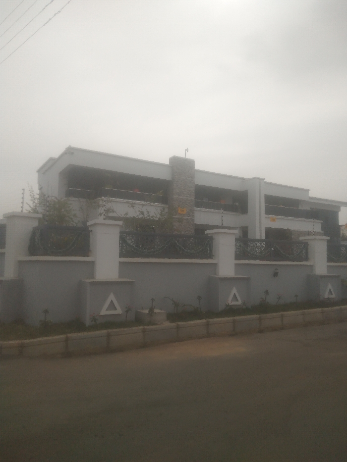 A daytime exterior photograph depicts a modern, multi-story building in Barikin Jirga Summa, Nigeria, viewed from across a dark paved road under an overcast sky. The building features a light-colored facade with multiple upper-level balconies, each equipped with dark railings. A vertical stone-clad column is centrally positioned on the building's exterior, displaying yellow warning signs. An antenna is visible on the roofline. The property is enclosed by a perimeter wall featuring a grey base, white support pillars, and decorative dark metalwork. Security measures include electric fence wiring along the wall's crest. White triangular decorative cutouts are integrated into the wall's lower sections. Sparse green vegetation is present within the property and along the wall's exterior base. No individuals are visible in the scene.