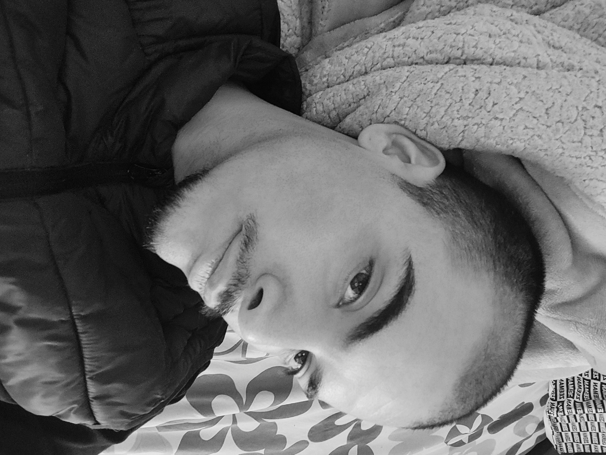 - "A black and white photograph captures a young adult male lying down, positioned from the chest up and looking towards the camera" by FM-tgonR2, licensed under CC BY 4.0