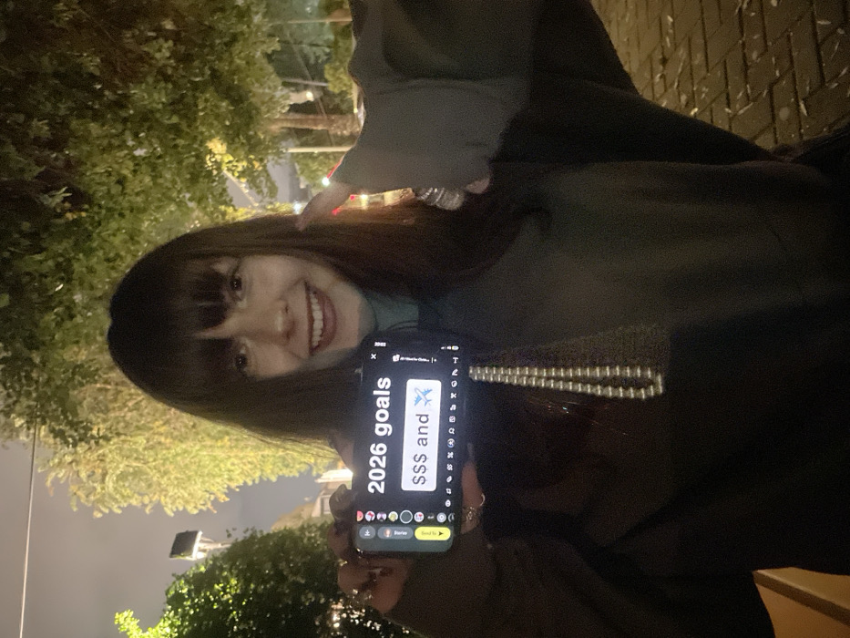 A young woman with dark hair and bangs smiles, holding up a phone displaying "2026 goals $$$ and airplane