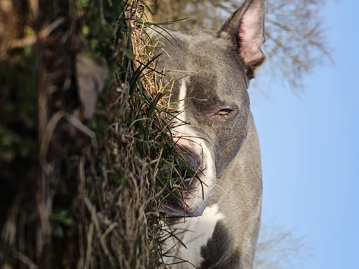 The image displays a gray-colored dog, consistent with an American Pitbull Terrier or similar breed, resting prone on the ground in Schifflange, Luxembourg. The dog exhibits a light gray coat with distinct white markings on its muzzle and chest. Its eyes are partially or fully closed, indicating a state of repose. The foreground consists of sharply focused green and dry brown blades of grass and underlying soil, viewed from a low perspective. In the background, a clear, bright blue sky is visible above the bare branches of a deciduous tree. Natural sunlight illuminates the scene, highlighting the dog and surrounding vegetation. No human individuals are present or interacting with the animal.