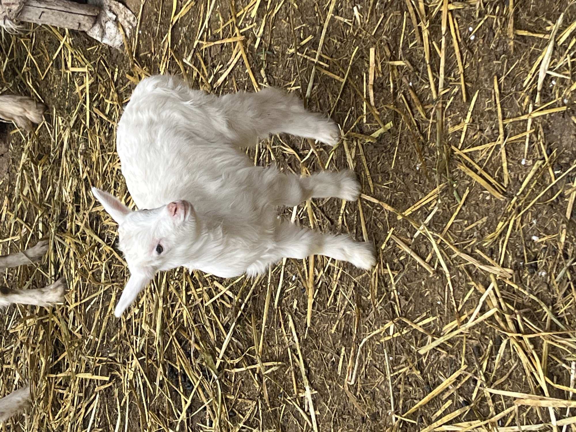 A white baby goat lies on a bed of hay, indoors. It is oriented towards the upper left of the frame. Its head is angled upward, and it appears to be looking at the camera. The floor beneath the hay appears to be made of dirt. Some wood is located in the upper left corner of the frame. Additional goat limbs are partially visible in the lower-left corner. The location is not discernible from the image.