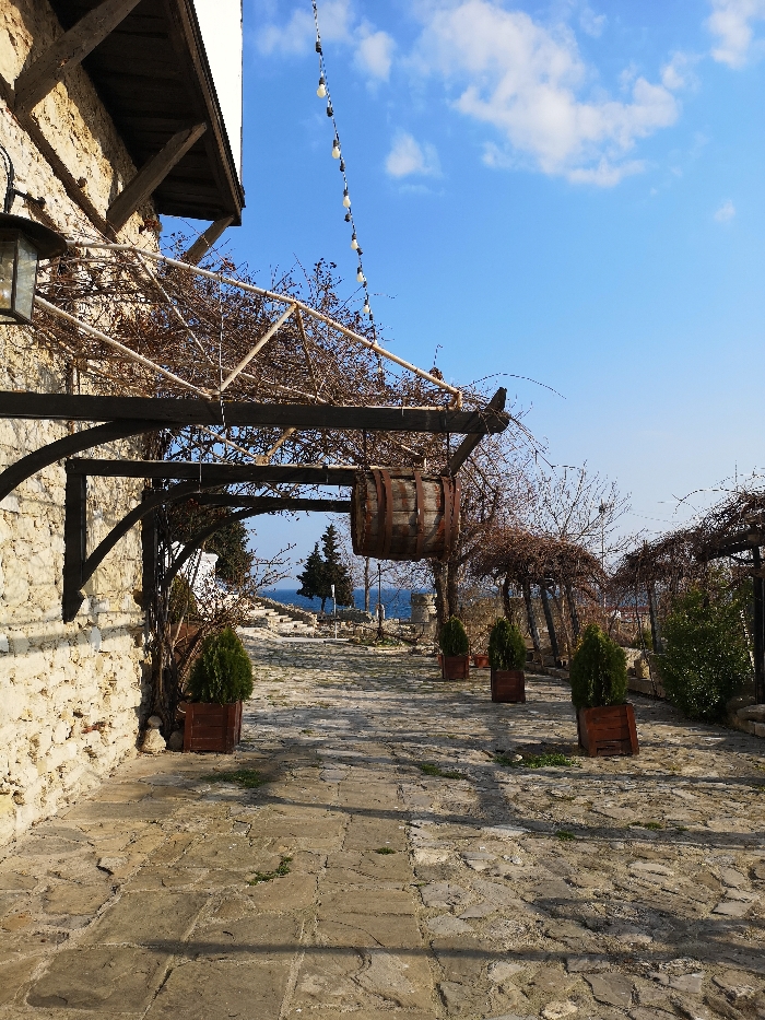 The image depicts an outdoor stone pathway in Nesebar, Bulgaria, viewed from a slightly elevated perspective