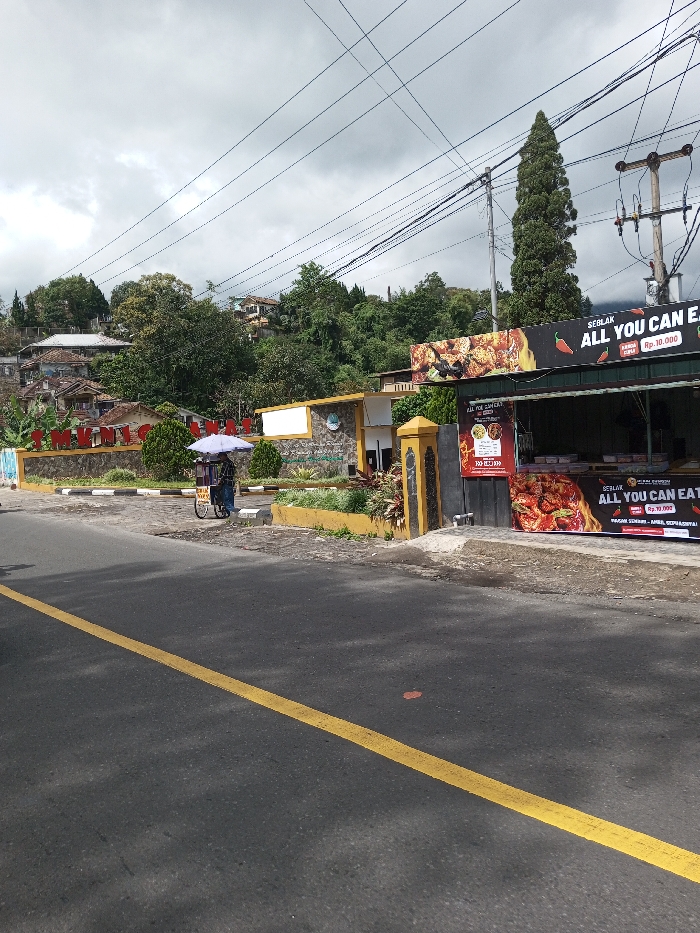 This image depicts a roadside scene, identified as being in the city of Taohom, Laos, under an overcast sky. The foreground features a dark asphalt road marked with a single solid yellow line. To the right of the road, a food stall or restaurant is present, displaying multiple banners that read "SEBLAK ALL YOU CAN EAT" with images of food items like fried chicken and chili peppers, along with pricing in Indonesian Rupiah (Rp. 10.000 and Rp. 15.000). The stall has an open-front counter where items are arranged. Adjacent to the food stall, a landscaped section features a low stone wall, green shrubs, and a partial sign starting with "T MUNUC...". A single individual, obscured from the chest down, stands next to a two-wheeled vendor cart topped with a large white umbrella, positioned on the roadside. The background consists of a steep hillside densely covered with trees and scattered residential buildings. Multiple overhead power lines crisscross the upper portion of the frame, connected to utility poles visible on the right. No direct actions or interactions between individuals are clearly depicted beyond the vendor's presence.