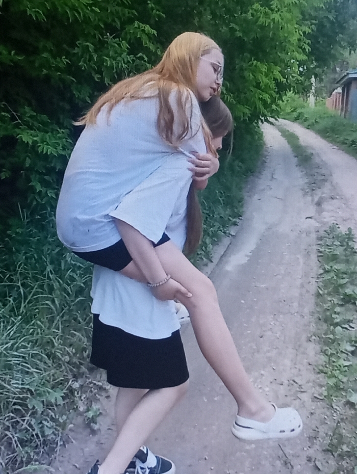 - "This image captures two individuals, likely young females, engaged in a piggyback ride on an unpaved dirt and gravel path" by FM-a9LKm1, licensed under CC BY 4.0