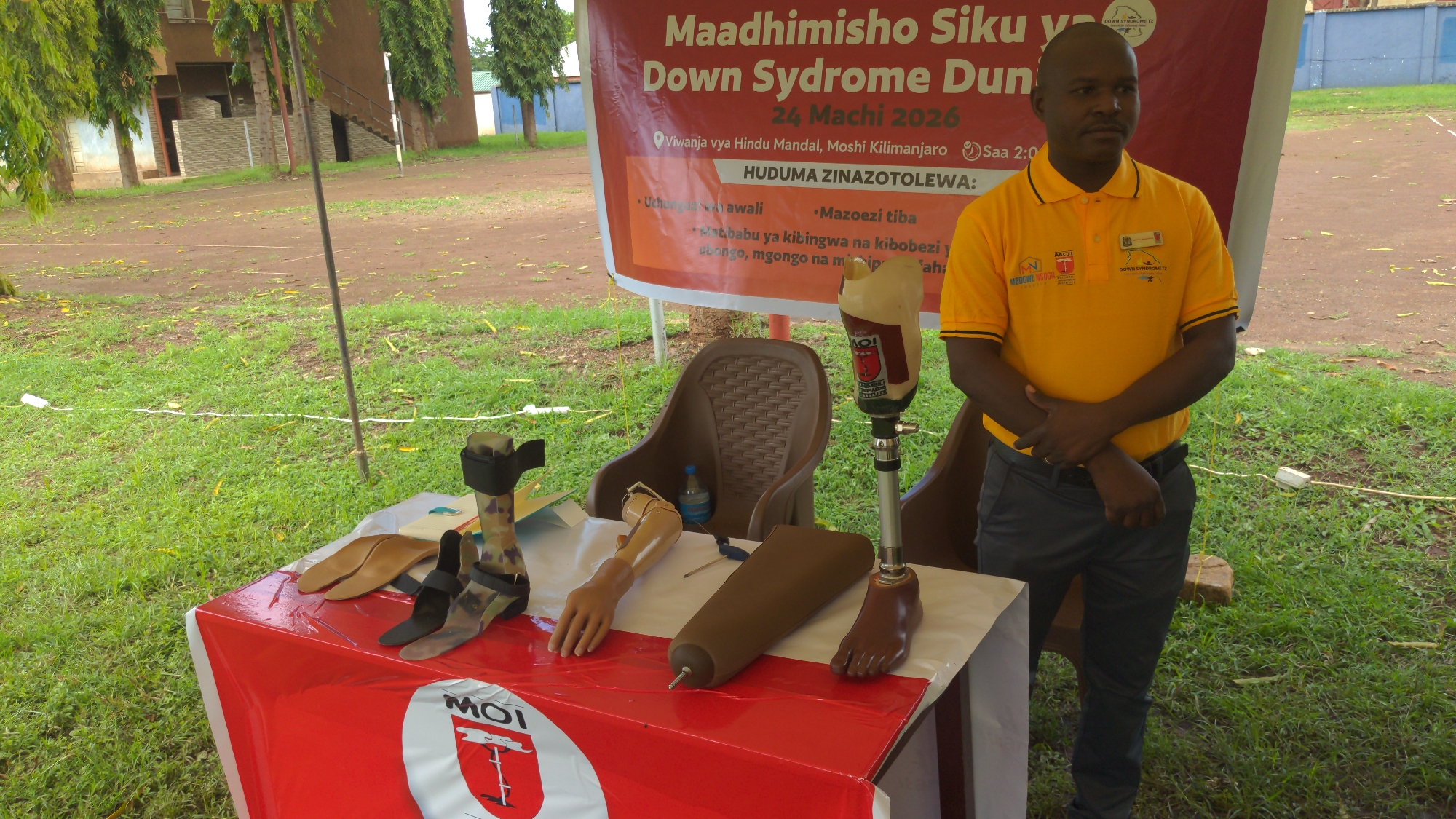 The image depicts an outdoor event or display located at Vivianja vya Hindu Mandal in Moshi, Kilimanjaro, Tanzania. In the foreground, a rectangular table covered with a red and white tablecloth displays various prosthetic devices, including a full leg prosthetic with a dark brown foot, a prosthetic forearm and hand, a cylindrical prosthetic limb component, a camouflage-patterned foot-ankle orthosis, and two tan orthotic inserts. The table features a "MOI" logo on its front. To the right of the table, an adult male stands, wearing a yellow polo shirt with "MOI" and "DOWN SYNDROME TZ" logos, and dark trousers. His arms are crossed, and he looks to his right. Behind the display table, two brown plastic chairs are visible, with a water bottle on one. A large red and white banner behind the man and table announces "Maadhimisho Siku ya Down Syndrome Dun..." (likely Down Syndrome Dunia for World Down Syndrome Day), dated "24 Machi 2026," and specifies the location as "Vivianja vya Hindu Mandal, Moshi Kilimanjaro." The banner also lists "HUDUMA ZINAZOTOLEWA:" (Services Offered), mentioning "Mazoazi tiba" (Therapy exercises). The environment consists of green grass and patches of bare earth, with various buildings and numerous green trees in the background. A white string or rope stretches across the grass.