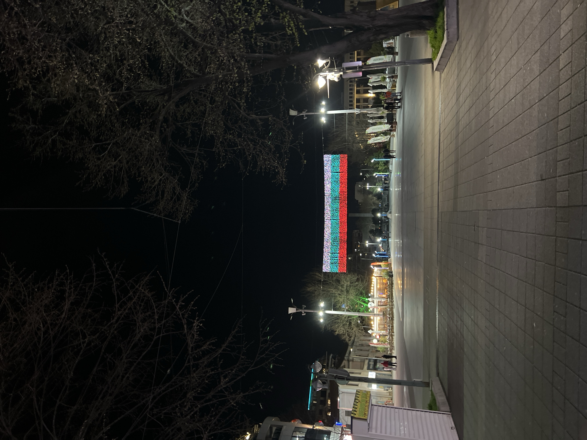 nighttime scene in Burgas, Bulgaria. The main focus is a vertically oriented display of lights arranged in the colors of the Bulgarian flag (white, green, red). This illuminated display is positioned above a pedestrian walkway paved with gray rectangular stones. Streetlights illuminate the area. Bare tree branches are visible on both sides of the frame. People are walking along the pavement further down the walkway. Buildings and commercial establishments, including restaurants with outdoor seating, are discernible in the background. A large tree is on the right. Other flags appear to be displayed at the sidewalk, just before the illuminated flag.