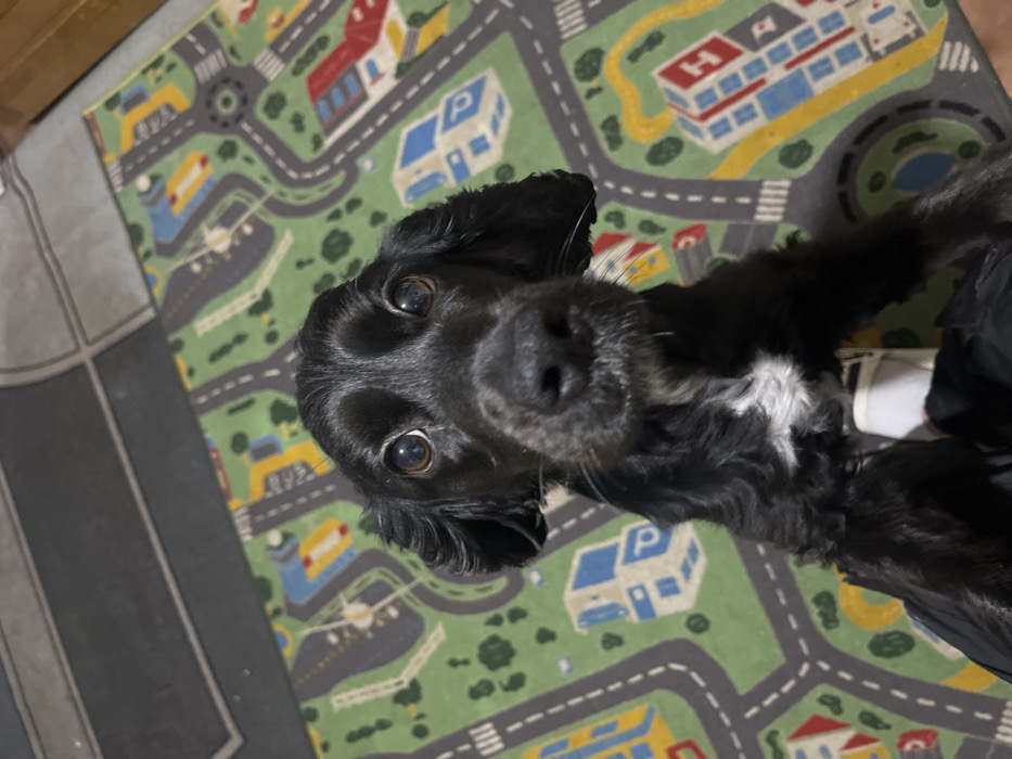 - "The image displays a black domestic dog, estimated to be a puppy or young adult, situated indoors in Varna, Bulgaria" by FM-Cx39I3, licensed under CC BY 4.0