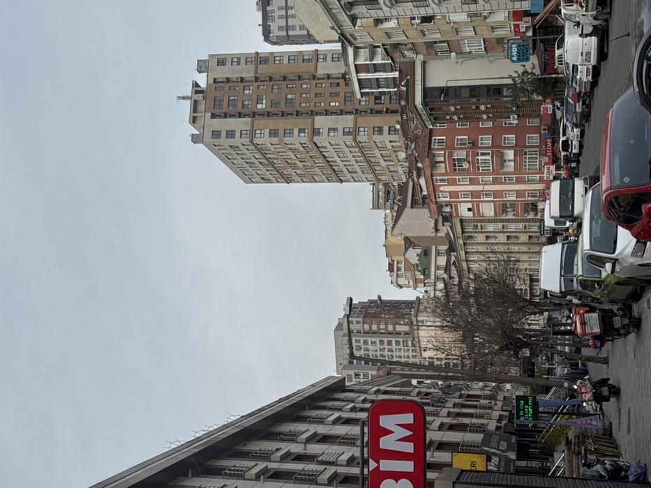 The image depicts an overcast urban street scene in Şişli, Turkey. The perspective is from the sidewalk, looking down a street lined with buildings of varying heights and architectural styles. To the immediate left, a multi-story building with light-colored facade panels and numerous balconies features a prominent, partially cropped red sign displaying "BİM" in white capital letters. Below this sign, on the sidewalk, are stacked wooden crates, potentially containing produce, and a small green LED display sign. Two motorcycles are parked on the sidewalk further down, one equipped with a large orange delivery box. A utility pole stands between the motorcycles and the street. The street itself is narrow and lined with numerous parked vehicles, including several white vans and cars of various colors such as white, red, and dark grey. Beyond the parked vehicles, a row of bare deciduous trees with dark branches runs parallel to the street. Along the right side of the street, buildings continue to rise. A multi-story building with a red facade and white trim is visible, displaying an "Eczane" (pharmacy) sign. Further down the street, another prominent sign for "A-101" (another Turkish supermarket chain) is visible. In the midground and background, the urban density increases. A tall, modern residential building, approximately 15-20 stories high, dominates the right side of the frame. It features a facade alternating between light beige and brown sections, with a visible rooftop structure. Behind this and other foreground structures, numerous other multi-story buildings, ranging from beige and grey to reddish hues, recede into the distance, suggesting a hilly urban landscape. The sky is uniformly overcast and light grey. No discernible individuals or active interactions are clearly visible, but the presence of delivery motorcycles and parked cars indicates an active urban environment.