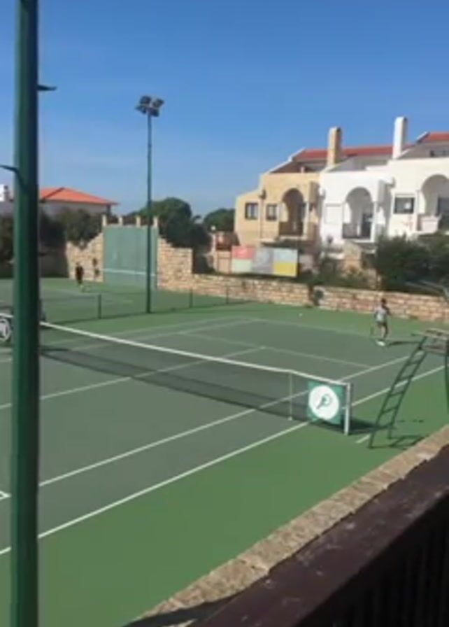 tennis court on a sunny day. There are two tennis players visible on the court. One player is in the far background on the opposite side of the court, wearing dark clothing. The second player is on the right-hand side closer to the camera and is wearing light-colored clothing. The tennis court is green with white lines, and there's a net separating the two sides. In the background, behind a low stone wall, there are residential buildings with orange and white walls. There's a light pole next to the tennis court, and the camera is positioned behind a wooden railing.