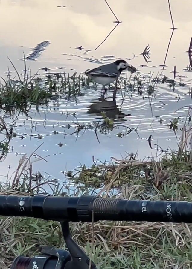 A small black and white bird stands in shallow water near a grassy bank. The water is reflecting the sky, which seems overcast. In the foreground, a fishing rod and reel are lying in the grass. The bird pecks at something in the water, then stands still, looking around. There are some thin, dry reeds and green plants visible in the water. The bird’s reflection is visible in the calm water.