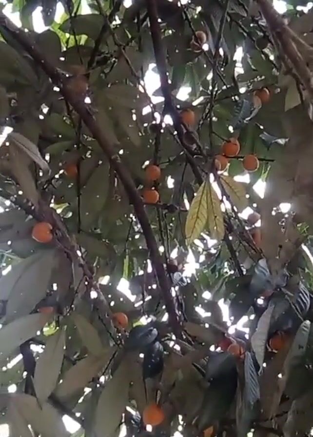 The video displays an upward view of a tree with orange fruit hanging from its branches