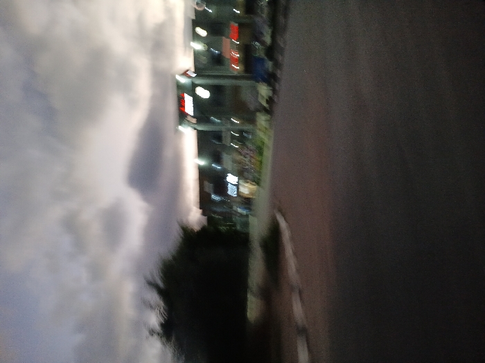 A hazy, vertically-oriented image depicts a cityscape beside a grey surface. Buildings are visible with illuminated signs and windows. In the foreground, blurred, cloud-like formations obscure some details. Some greenery is also present. The overall scene suggests an urban environment at night, possibly with a weather phenomenon occurring.