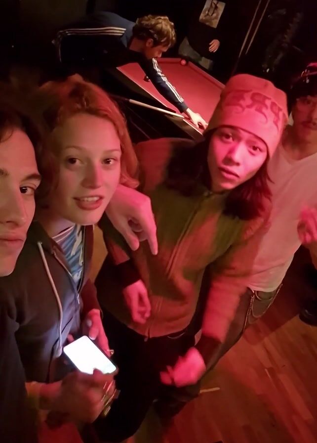 Four people are in a darkly lit room, illuminated with red light. The person holding the camera is partially visible on the left, a woman with shoulder-length red hair stands next to them, holding a phone. A third person, wearing a yellow bandana, stands between the women and puts an arm around one of them. The fourth person stands behind the person wearing the bandana, on the right. Behind the group, a person stands by a pool table. The person wearing the bandana points at the camera, obscuring the view. The two women appear to be yelling or shouting in excitement. The setting seems casual and convivial.