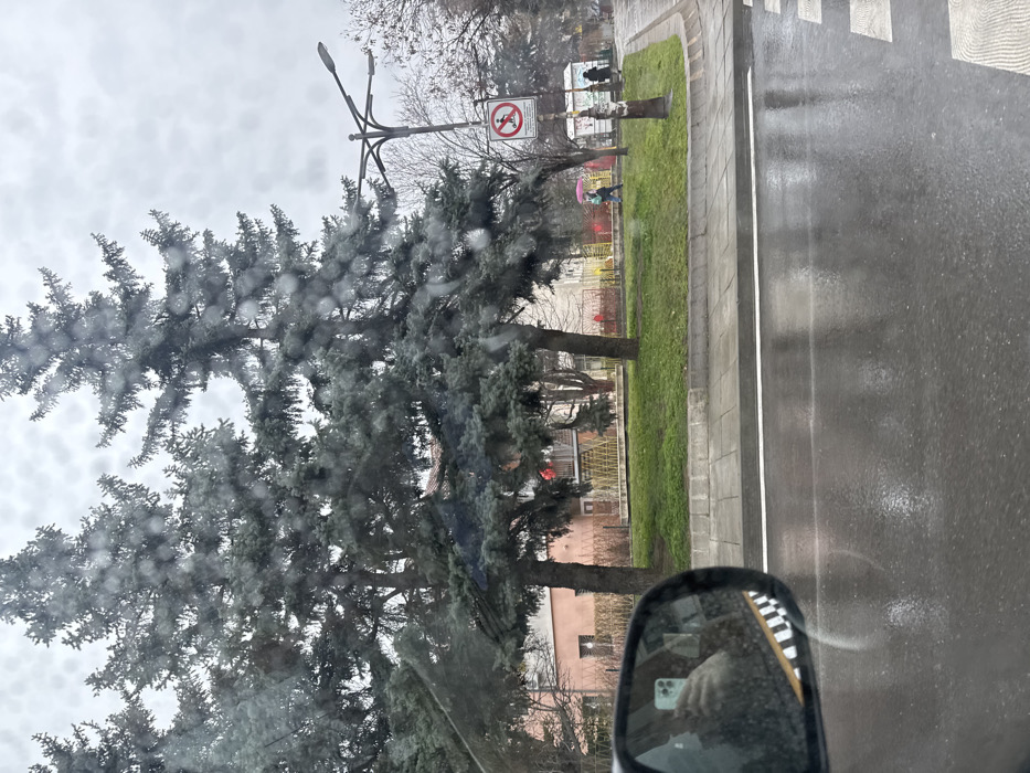 The image depicts an urban street scene in Blagoevgrad, Bulgaria, viewed from inside a vehicle through a rain-splattered window under an overcast sky. In the immediate foreground, the wet surface of a vehicle's side mirror is visible on the left, reflecting a person's hand holding a light-colored smartphone with three camera lenses. Below this reflection, a black and white checkerboard pattern, consistent with taxi livery, is partially visible. The road surface, rendered glossy by precipitation, occupies the lower third of the frame, showing a single solid white lane line and the start of a pedestrian crossing on the far right. Beyond the road, a raised grassy median or park strip runs parallel to the street. Two prominent, mature evergreen trees with dark green-blue needles stand centrally within this strip. To the right of these trees, a concrete sidewalk is present. A multi-branched, dark-colored decorative street lamp post rises from the sidewalk, featuring multiple light fixtures. Below the lamp post, a circular red and white regulatory sign prohibiting pedestrians is mounted. Further right on the sidewalk, a small, white kiosk or information stand is visible. Several individuals are present: one person, holding a bright pink umbrella and wearing a light blue jacket or hoodie, walks from left to right across the grassy area behind the main trees. Two additional, indistinct figures are visible further right, near the kiosk on the sidewalk. In the background, a multi-story building with a light pink lower facade and a grey upper section is partially visible behind the trees on the left. Red objects are discernible on a balcony of this building. Beyond the main trees and buildings, additional bare-branched deciduous trees suggest a late autumn or winter season. The overall environment is wet, indicative of recent or ongoing rainfall.
