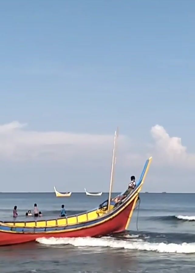 colorful fishing boat anchored near a beach on a sunny day. The boat is primarily red with yellow and blue trim. A person is sitting on the bow of the boat. In the background, several people are wading and swimming in the ocean. There are also two other small boats visible in the distance. The sky is blue with some scattered clouds, and gentle waves are lapping at the shore.