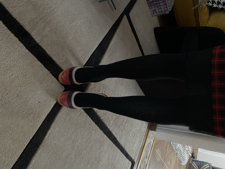 The image displays the lower body of an individual, from the mid-thigh down to the feet, positioned indoors. The scene is identified as being in Kunje, Montenegro. The individual wears the hem of a red and black plaid garment, opaque black tights or leggings, and a pair of wedge-heeled shoes. Each shoe features a red toe, a light beige central band, and a dark blue or black upper band, resting on a natural wood-colored wedge sole. The person is standing on a light-colored, textured rug with a distinct black geometric pattern forming an intersecting grid. In the background to the left, parts of a yellow upholstered sofa and a dark piece of furniture are visible, along with a transparent, faceted object. To the right, a reflective surface reveals a partial view of a tiled floor and another light-colored, patterned rug.