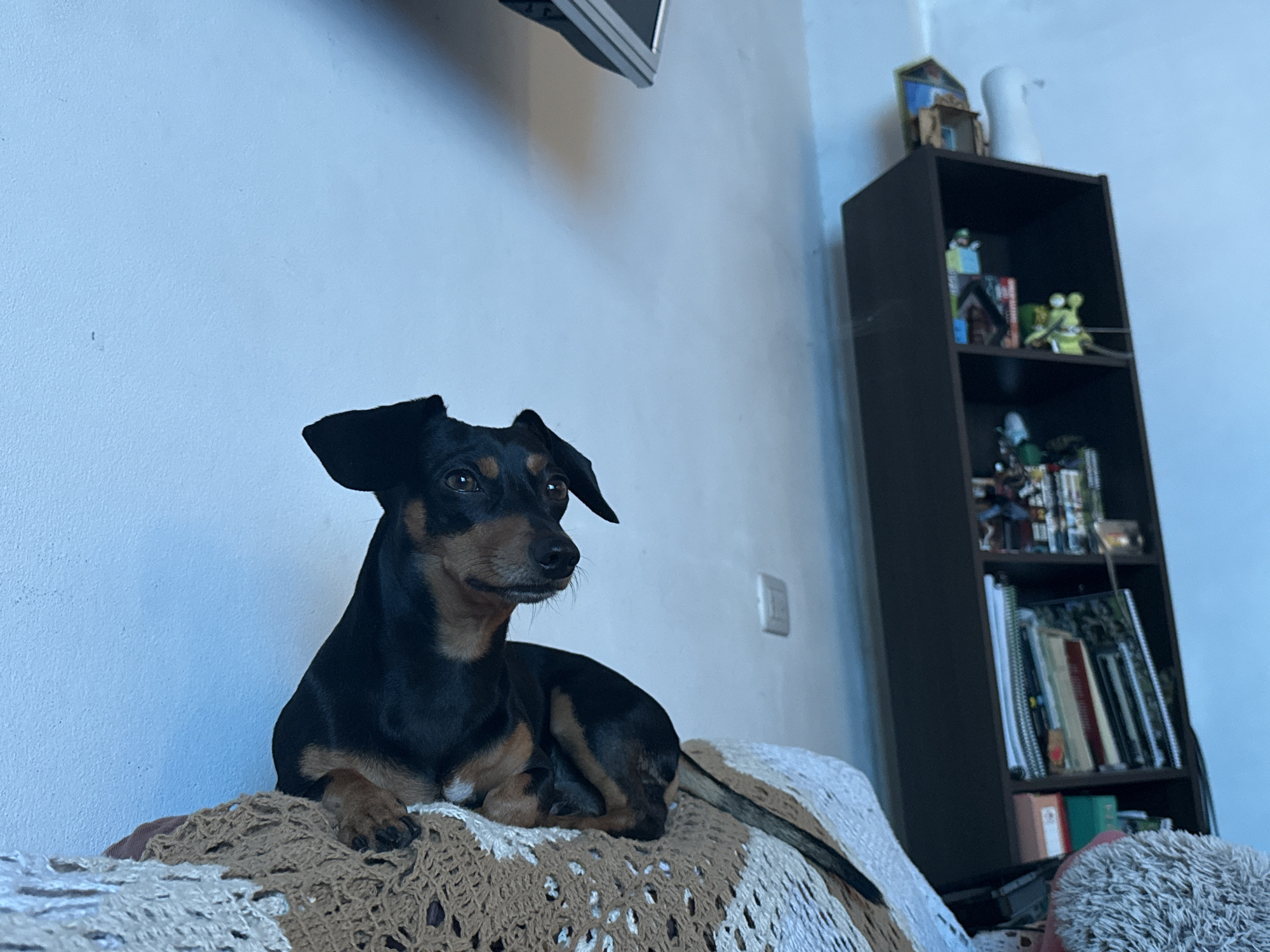 An indoor scene in San Fernando del Valle de Catamarca, Argentina, depicts a short-haired dog resting on upholstered furniture. The dog, predominantly black with tan markings on its muzzle, chest, and paws, is positioned facing the right side of the frame, with its head slightly turned to its right, exhibiting attentive dark brown eyes. Its front paws are situated on a knitted blanket featuring a brown and cream geometric pattern. The background consists of a light blue wall. In the upper left, a portion of a silver-framed television is mounted on the wall. To the right, a dark brown, four-shelf bookcase is visible, containing assorted objects including decorative items, books, and binders. A white electrical outlet or light switch is present on the wall to the right of the dog's head. A section of a furry, light-colored object occupies the lower right corner of the image.