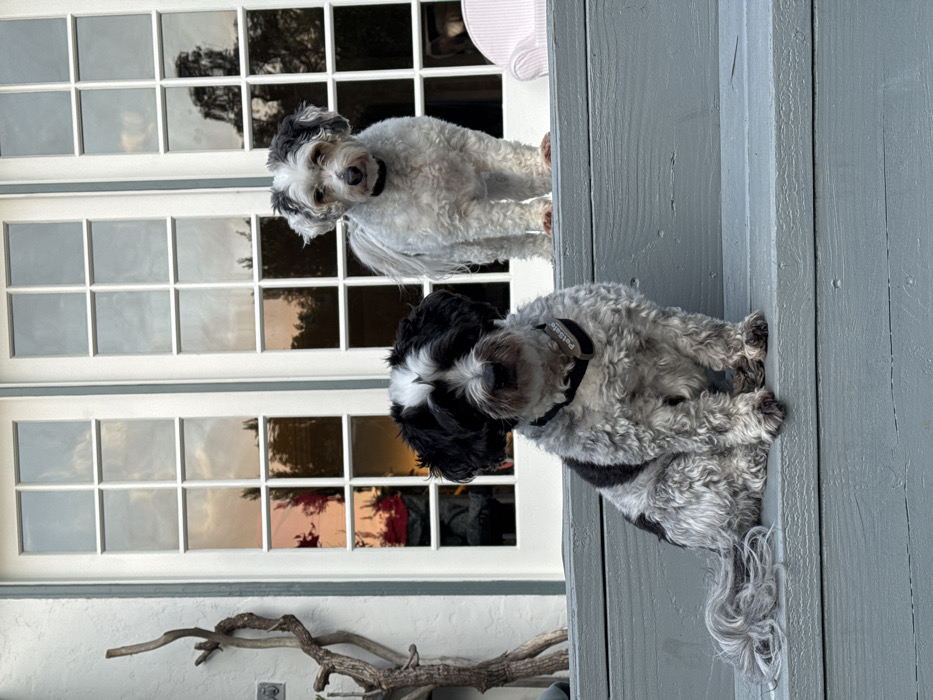 Two small, fluffy dogs stand outside a windowed building. The top dog is white with grey and black markings. The bottom dog has a black head and grey body and wears a black "PetSafe" collar. A gnarled branch rests on the ground below the window. The building is painted grey and white. The image is rotated 90 degrees clockwise.
