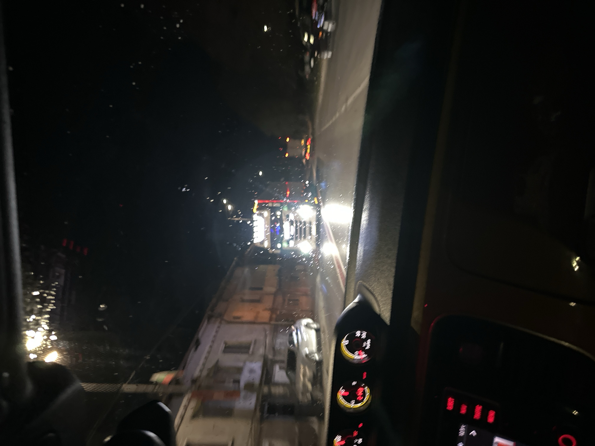 nighttime view from inside the cab of a truck, likely in transit