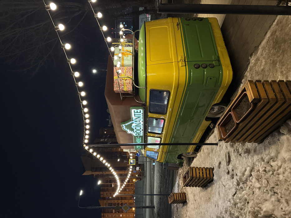The scene depicts a static, two-tone yellow and green commercial van, prominently displaying a neon green sign reading "MOBILE - ROCINANTE," parked on a paved surface beside a snow-covered verge at night in Krasnoyarsk, Russia. The van, styled as a mobile unit, features a brown, elongated rooftop structure and a roof rack carrying several gift-wrapped boxes, adorned with yellow ribbons and patterned paper. The interior of the van is illuminated, casting light through its windows. The foreground consists of patchy snow, dirt, and a wooden walkway. Three slatted wooden planter boxes are visible: two on the snow-covered ground and one on the wooden walkway, all appearing to contain only soil or be empty. Overhead, strings of globe-shaped white lights are suspended between tall, dark poles, illuminating the area around the van. In the mid-ground, a paved road is visible, partially obscured by snow and flanked by a streetlight. A pedestrian crossing sign is discernible. The background features several multi-story residential or commercial buildings with illuminated windows, indicating an urban setting. Bare deciduous trees are also visible against the dark night sky. No individuals, explicit actions, or direct interactions are observed in the image.