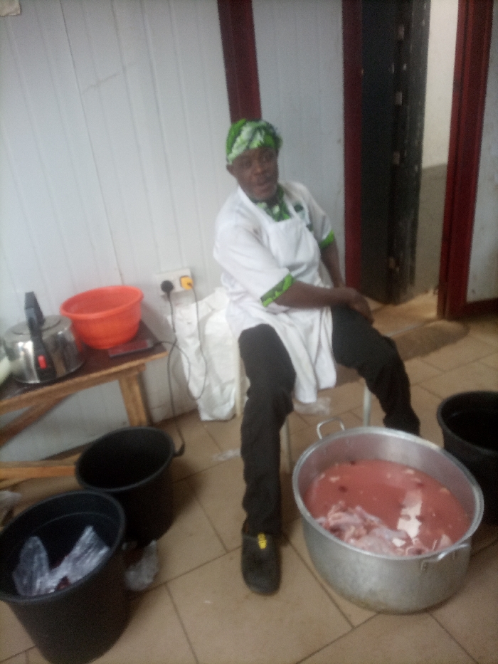 In an interior food preparation area in Opete, Nigeria, a person is seated on a metal stool. The individual wears a white chef's coat with green patterned trim on the sleeves and collar, a white apron, dark trousers, and a green patterned headwrap. They are positioned to the right of the frame, facing forward. To their left, a wooden table holds a metallic kettle and an orange plastic bowl. An electrical outlet with two plugs is visible on the white paneled wall above the table, with a white fabric draped below it. The floor is tiled. In the foreground, a large, oval-shaped aluminum pot contains a reddish liquid and several pieces of raw meat. Two black plastic buckets are on the floor to the left, one containing items in clear plastic bags. A third black bucket is partially visible on the far right. The wall on the right features a dark reddish-brown vertical beam, possibly part of a door frame.