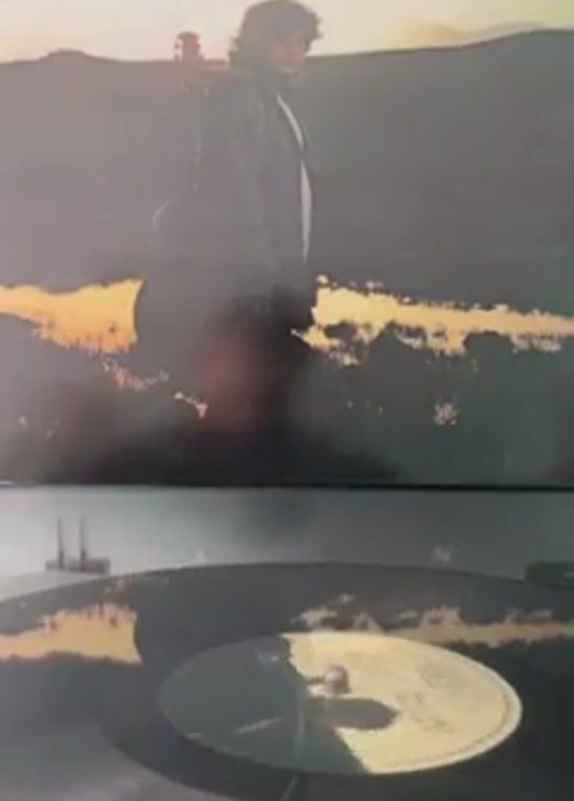 n album cover on top of a record player with the vinyl spinning. The album cover is for “Nero a meta” by Pino Daniele. The cover has an image of the musician standing in a field with a guitar on his back, staring off into the distance. The record on the player is black with a white label. The background is out of focus.