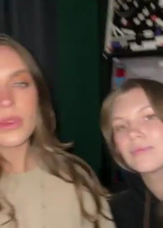Two young women are recording a selfie video in what appears to be a bar or music venue