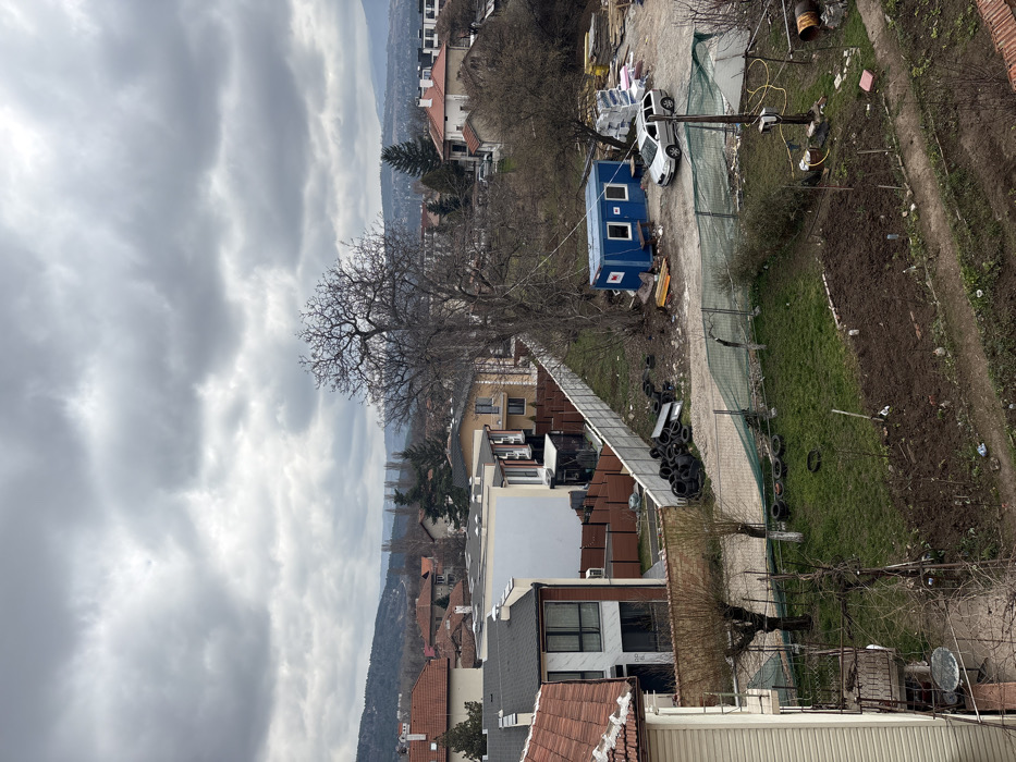 This image captures an elevated view of a residential and semi-rural area on the outskirts of Sofia, Bulgaria, with Vitosha Mountain visible in the distant background under an entirely overcast sky. The scene is static, with no individuals present. In the foreground, the lower left quadrant displays a partial view of a building's light-colored facade with a small balcony. Below this, a private garden plot features a mix of grass and cultivated soil, containing scattered discarded tires. A green mesh fence separates this garden from the midground. The midground reveals a mixed-use area. A dirt path runs horizontally across the lower portion. To the right of the path, a blue portable cabin or shipping container, equipped with two small white windows and a red square symbol (possibly a Red Cross variant), is situated on unpaved ground. A silver station wagon is parked next to this container. Adjacent to them, construction materials, including stacks of insulation and wooden planks, are piled. A large, prominent deciduous tree stands centrally, bare of leaves, indicating late winter or early spring. To the left, a tall white concrete fence separates this area from modern multi-story residential buildings, some exhibiting contemporary architectural designs with dark roofs and large windows. A substantial accumulation of discarded vehicle tires is visible against this fence. The background consists of a dense concentration of residential houses with diverse architectural styles, including traditional homes with red-tiled gabled roofs and newer buildings with flat roofs. Beyond these structures, the distinctive outline of Vitosha Mountain is discernible on the horizon, partially obscured by the heavy, uniform grey cloud cover. The overall environment suggests ongoing development and a transition between urban and natural landscapes.