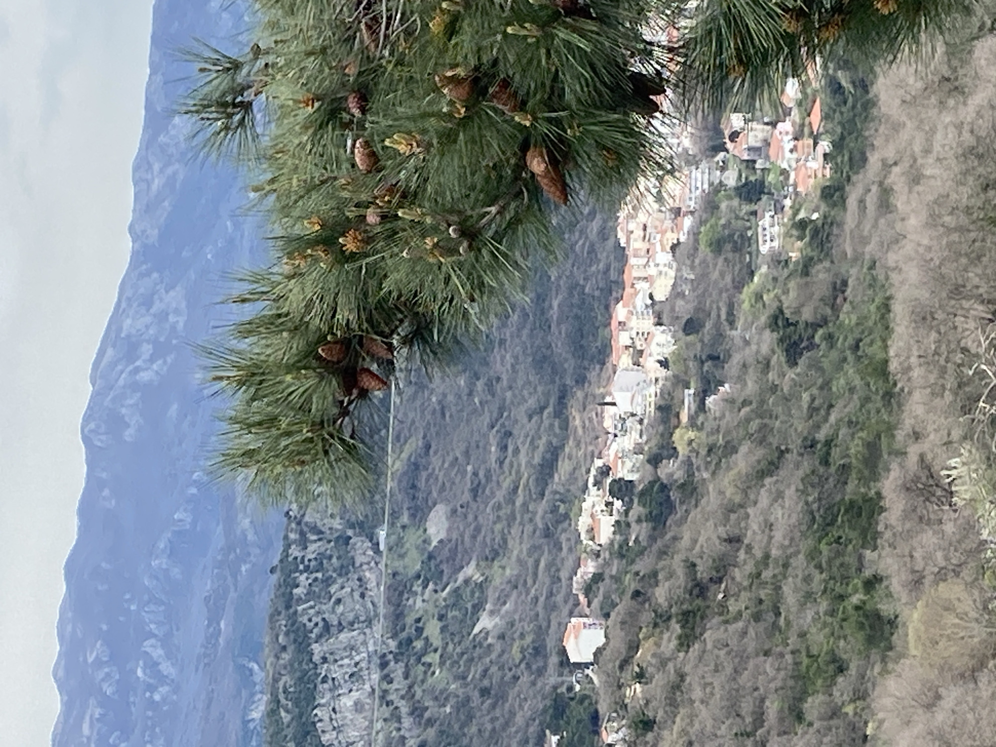 mountainous landscape with a town nestled on a hillside. In the foreground, a pine branch with cones hangs, slightly obscuring the view. The mountains in the background are blue-grey in color. The town on the hillside consists of buildings with orange-tiled roofs and light-colored walls. The hillside is covered with trees. The location is Podostrog, Montenegro.