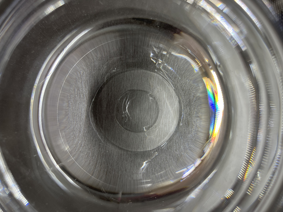 The scene is located in the city of Sheynovo, Bulgaria. The image presents an overhead, downward-facing view into the interior base of a clear, colorless glass vessel. The bottom surface of the glass exhibits a series of distinct concentric circular ridges, likely a manufacturing or decorative feature. The transparent nature of the glass allows visibility of a textured, matte grey surface directly beneath, which appears to be a flat, solid material, possibly wood with faint grain. Scattered across the internal glass surface are multiple linear scratches and minor imperfections. Prominent light dispersion is visible in the lower central region, manifesting as a horizontal band displaying a full spectrum of colors, including red, orange, yellow, green, blue, and violet. Additional, fainter spectral glints are present in other areas, such as the upper right. No individuals, animate subjects, or explicit actions are depicted. The interaction observed is solely that of light passing through and refracting within the glass material. The immediate environment is indeterminate beyond the visible surface beneath the glass.