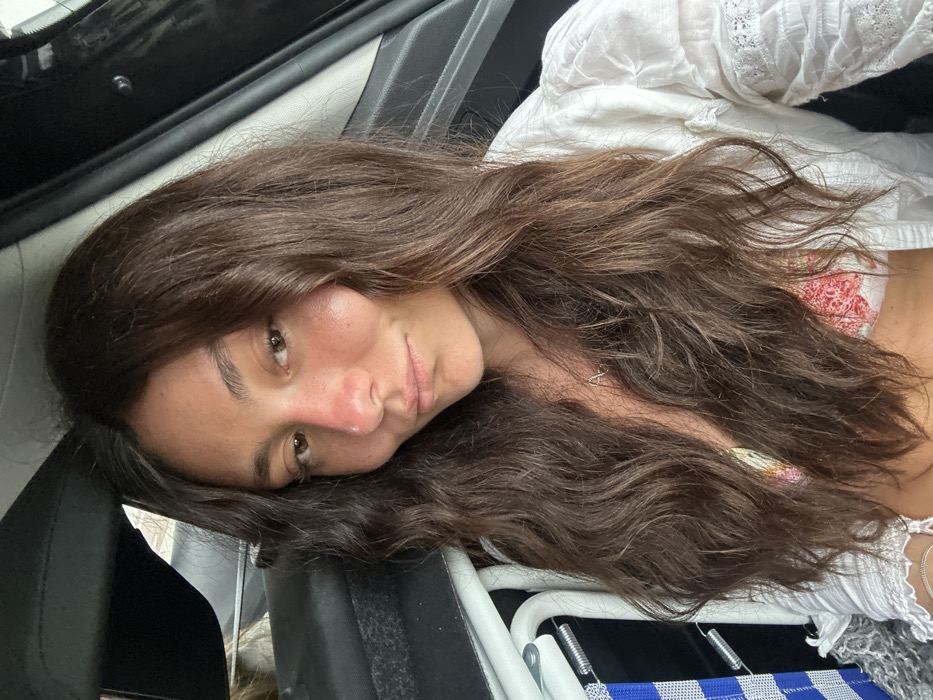 A single female subject is positioned in what appears to be the rear passenger seat of a private vehicle. The specific location within Palma de Mallorca, Spain, is not discernible from the visual evidence. The subject is an adult with a tanned complexion, long, wavy, dark brown hair, and brown eyes. A noticeable sunburn is present on her nose and upper cheeks. She has a small stud piercing on her left nostril. Her lips are slightly pursed, and she is looking directly into the camera. She is wearing a light-colored, possibly white, collared shirt or cover-up with textured fabric and lace detailing, worn open. Underneath, a portion of a red and white patterned garment, consistent with a floral bikini top, is visible. A delicate, silver-toned necklace with an "A"-shaped pendant rests on her décolletage. A light-colored bracelet or multiple thin bracelets are visible on her left wrist. To the left of the subject, a white tubular metal frame and a blue and white striped fabric, possibly belonging to a folding beach chair or similar outdoor equipment, are visible. The dark interior of the vehicle, including a black headliner and a seatbelt mechanism, is visible in the upper and right portions of the frame. Natural light illuminates the subject from an unseen source, suggesting daytime.