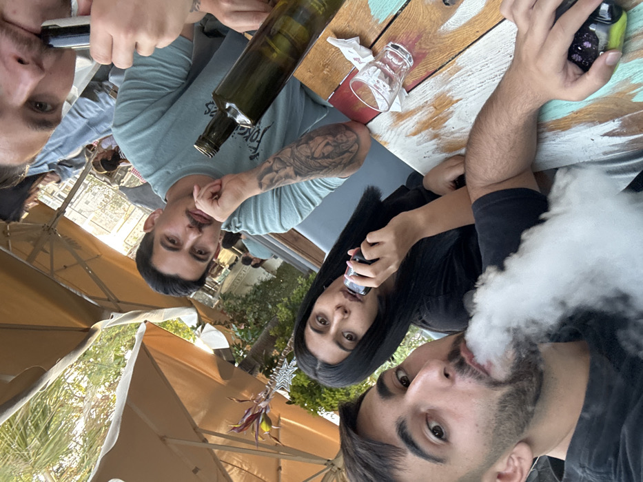 The image depicts an outdoor cafe or restaurant setting in Holon, Israel, during daylight hours. Three individuals are seated around a distressed wooden table. In the immediate foreground on the left, a male with dark hair and a beard, wearing a black t-shirt, is exhaling a large cloud of white vapor from a vaping device held in his left hand, which is partially visible. Directly behind him, a female with long dark hair, wearing a black top, holds a vaping device to her mouth. To the right of the female, a second male with dark hair and a mustache, wearing a light blue t-shirt with a visible tattoo on his left forearm, rests his chin on his right hand. On the multi-colored distressed wooden table, an empty clear glass tumbler, a crumpled white napkin, and a dark green glass bottle are visible. Beige patio umbrellas are partially visible overhead, and green foliage along with distant blurred figures and buildings are present in the background.