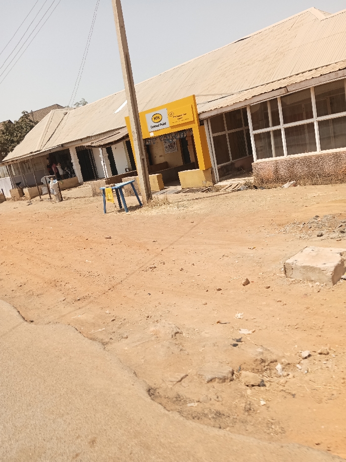 This image depicts a dusty, sunlit street scene in Kwang, Nigeria. A long, single-story building with a light-colored corrugated metal roof dominates the background. The building features multiple sections: to the right, a storefront with multi-pane windows and a light brown lower facade; centrally, a prominent yellow structure bearing the "MTN Connect Point" logo and text "King of Content Shop & Call"; further left, an open doorway reveals a person partially visible inside, along with merchandise or objects. A tall, light-colored utility pole stands vertically in the midground, slightly left of the yellow MTN structure. Wires extend upwards from the pole, out of frame. The immediate foreground consists of an unpaved, reddish-brown dirt road, showing signs of wear with small stones, patches of dry earth, and a section of damaged concrete or asphalt at the bottom left. A light blue plastic stool is positioned near the center-left, with a small yellow object, possibly a sign, hanging from it. A single concrete block rests on the ground in the far right foreground. The sky is clear and light blue. Sparse, dry vegetation is visible along the base of the building on the right. No discernible actions or interactions are taking place.