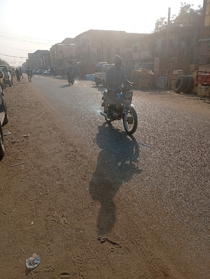 A bustling street scene unfolds with a motorcyclist as the focal point, riding on a paved road. Buildings line the right side, packed with goods. People stroll along the left side of the road. The sun casts long shadows. The scene is typical of an urban street filled with commerce and movement.