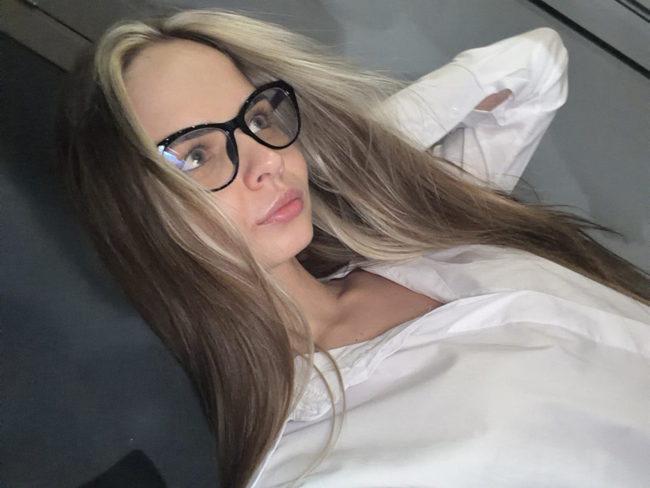 A woman lies on a dark surface wearing a white collared shirt and black framed glasses. She has long, light brown hair with blonde highlights framing her face. Her expression is relaxed, lips slightly parted. One arm is positioned behind her head. The image is a close-up, focusing on her face and upper body.