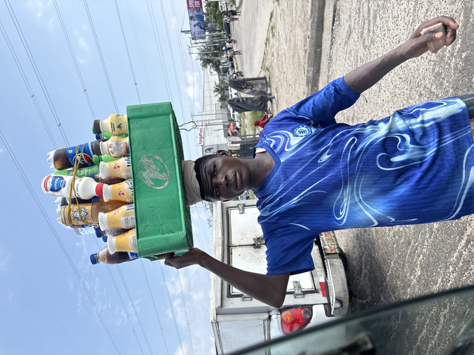 A young male street vendor is centered in a daylight outdoor scene in Ikate, Nigeria