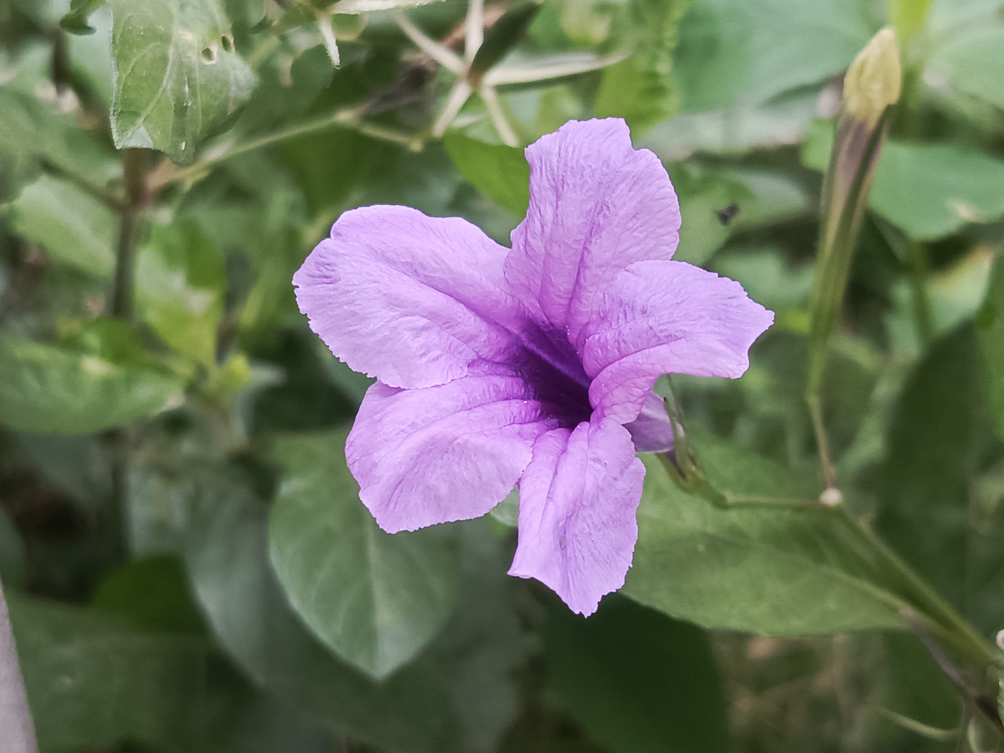 A close-up shot captures a purple flower in full bloom, surrounded by a lush green background of leaves. The flower is the focal point, its petals textured and delicate in appearance. Adjacent to the flower is a green, unopened flower bud. The background foliage is dense, creating a natural, unkempt setting. The image was taken in Tinaco, Venezuela. No people are visible.