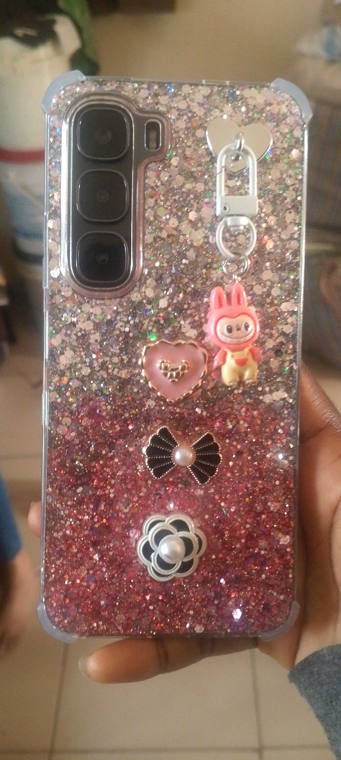 A right human hand, with medium-dark skin, holds a smartphone vertically against a blurry indoor background in Unknown, Unknown. The smartphone is enclosed in a clear, glitter-filled case where the glitter transitions from silver-white at the top to pink-red at the bottom. The phone's rear features a prominent black rectangular camera module with two visible lenses and a flash positioned on its upper left side. A silver-toned metal carabiner clasp hangs from a heart-shaped base affixed to the upper right of the phone case. From this clasp, a pink and light yellow rabbit-like character charm with large ears is suspended. Below the clasp and to the left, a pink heart-shaped emblem with a gold-colored border and a small cluster of gold-colored beads in its center is attached to the case. Directly below this heart, a black bow-shaped emblem with a white pearl at its center and a gold-colored border is affixed. At the lower portion of the case, a white flower-shaped emblem with a black outline and a white pearl in its center is present. The hand's thumb is visible along the right edge of the phone, with other fingers partially obscured beneath. A grey fabric cuff is visible at the wrist. The background exhibits indistinct shapes and a partially visible tiled floor, indicating an indoor setting.