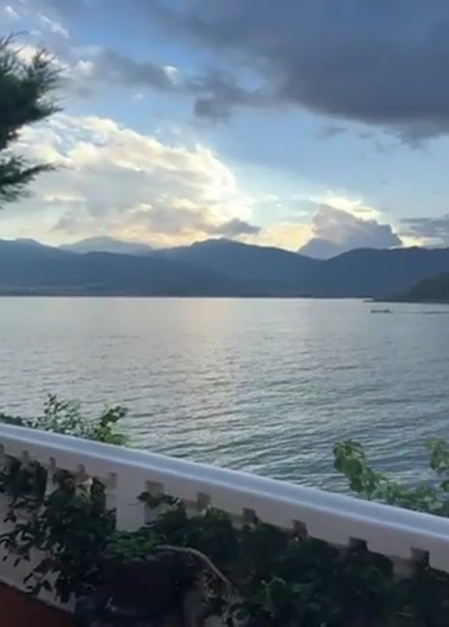 view from a balcony overlooking a large body of water. In the distance, there are mountains silhouetted against a cloudy sky with some sunlight breaking through. The balcony has a white railing with plants growing along it. A hand reaches into the frame holding a string of lights. The lights are then hung along the railing. The water is calm with a slight ripple. The scene appears peaceful.