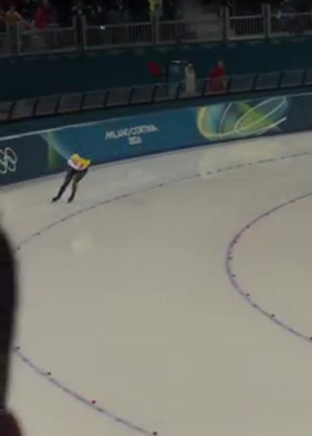 two ice skaters on an oval ice rink. The skaters are wearing speed skating outfits. The rink is marked with blue lines and red dots. In the background, there is a banner with the words "MILANO CORTINA 2026" and the Olympic rings. There are spectators in the stands above. The camera is static and focused on the skaters. The video appears to be taken from a high vantage point.