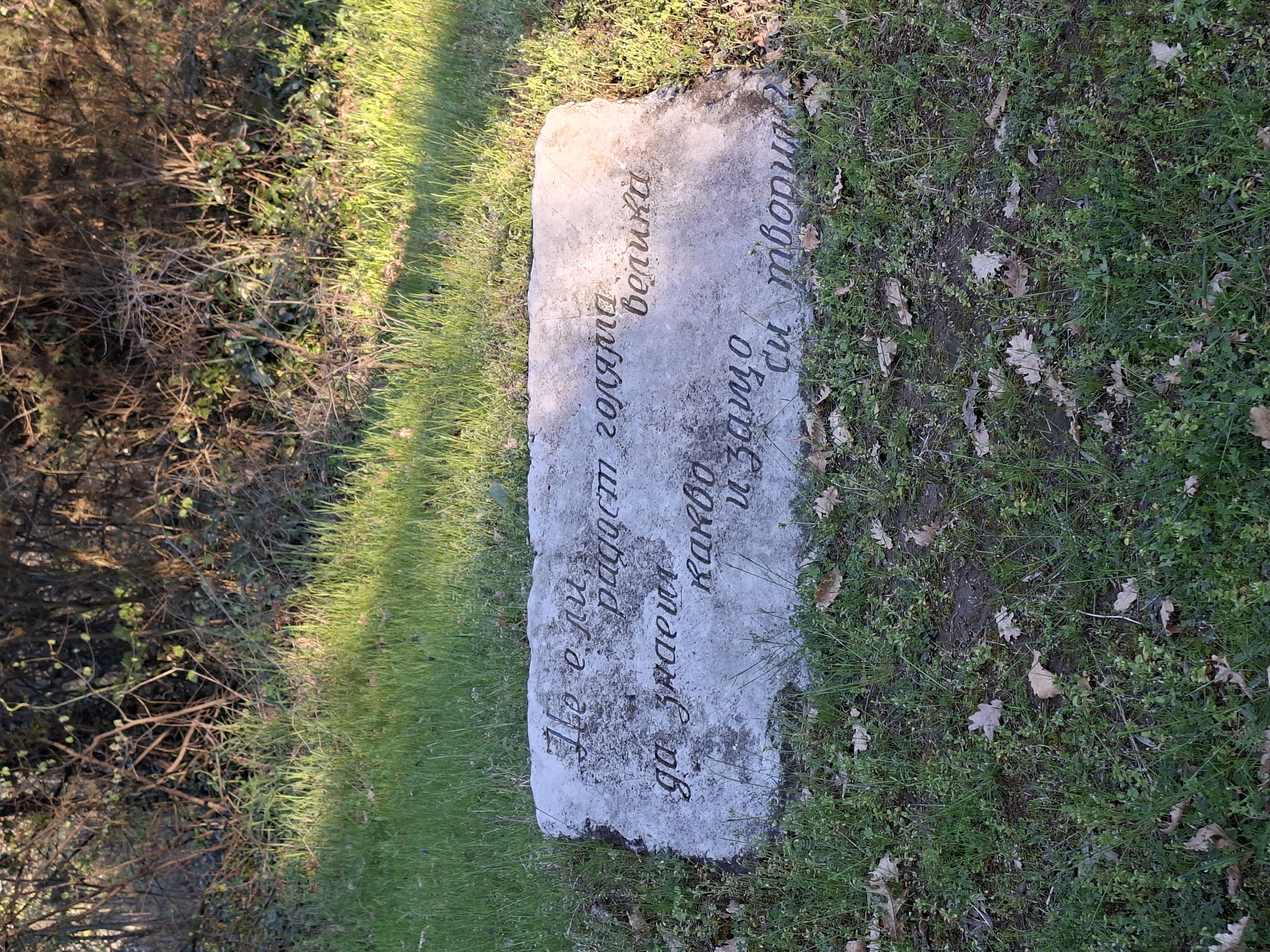 The image captures a stone slab engraved with text, set amongst a grassy area with some fallen leaves. The stone is likely a memorial or marker. Some bushes are visible on the left side. Based on the text, this is likely located in Dimitrovgrad, Bulgaria.