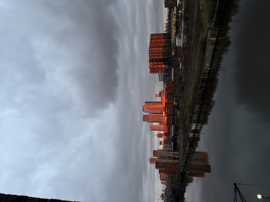The image displays a panoramic view of an urban landscape in Salford, United Kingdom, captured during sunrise or sunset under an overcast sky. The foreground features a dark body of water, likely a canal or river, exhibiting reflections of the illuminated buildings. A concrete embankment with sparse, low-lying vegetation lines the far bank of the water. To the immediate left, a partial view of a brick structure and a single light fixture are visible. The midground is dominated by a cluster of modern high-rise buildings, primarily residential towers, several of which are intensely illuminated with a striking orange-red hue by the low-angle sun. Prominent among these are several tall, slender towers in the center-left, and a wider, multi-story building further to the right, both reflecting the strong orange light. Behind the embankment, at ground level, various smaller structures and areas of bare earth or sparse vegetation are present. A red tower crane is visible on the far left horizon, indicating ongoing construction. The background consists of an expansive, heavily clouded sky, uniformly grey with variations in density, indicating an overcast condition. No individuals or discernible actions are present within the scene. The lighting creates a stark contrast between the brightly illuminated building facades and the muted, grey tones of the sky, unlit structures, and water.