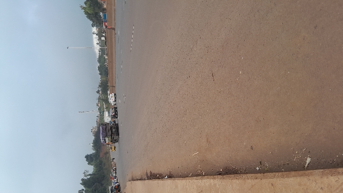 view of a road in Kikuyu, Kenya. The road is paved and there is a concrete curb on the left. The image is taken from the curb, looking down the road towards the horizon. There are several vehicles in the distance, including a semi-trailer truck, several cars, and a motorcycle. The vehicles are moving in both directions. The road is dry and dusty. The sky is overcast and grey. There is a small amount of vegetation on the sides of the road, and several buildings can be seen in the distance. The coordinates -1.213, 36.661 are in the vicinity of the busy Waiyaki Way in Kikuyu. The image shows a typical scene of traffic in the area.