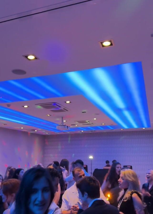 group of people dancing in a room with blue and red lighting