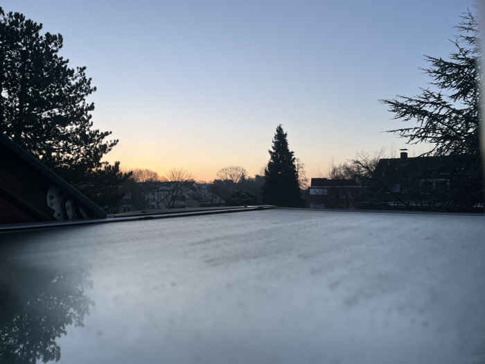 A tranquil sunrise casts a soft glow above a wintry scene. Silhouetted trees flank the horizon, with rooftops and buildings nestled between them. The sky fades from pale blue to a gentle orange near the horizon. The foreground features a flat, reflective surface, possibly covered in frost or ice, mirroring the shapes of the trees above. The scene evokes a sense of calm and cold beauty.