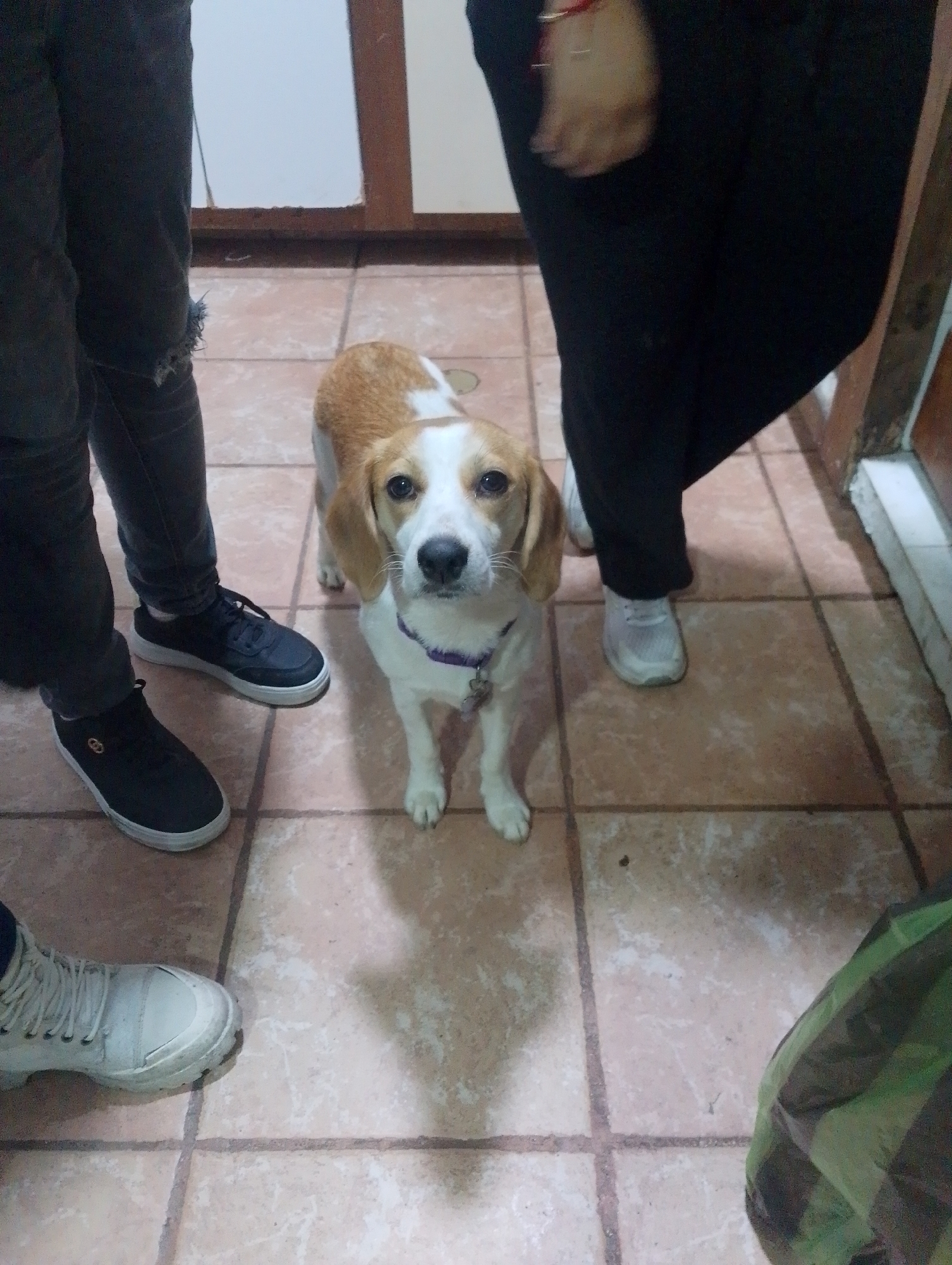 **Location:** Caracas, Venezuela (derived from details in the image) **Scene:** Indoor setting with tiled flooring. The tiles are light brown with dark grout lines. **Subjects:** * A medium-sized dog, predominantly white with brown markings on the head and ears. The dog is wearing a purple collar and a tag. * Three individuals are partially visible: * One person wearing dark grey jeans with distressed details and black sneakers. * One person wearing black pants and white sneakers. * One person wearing white sneakers **Objects:** * A partial view of a white cabinet with wooden trim. * A camouflaged bag **Actions/Interactions:** * The dog is standing and looking directly at the camera. **Environment:** * The flooring is light brown tiles with dark grout lines. * The lighting in the room appears to be natural, with some shadows.