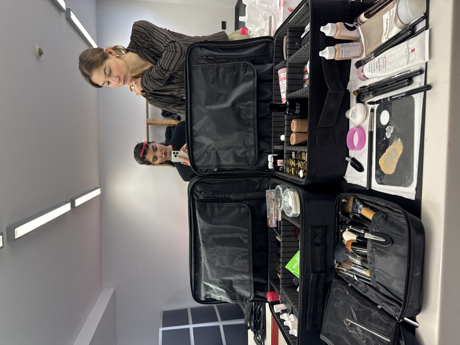 A woman in a striped jacket looks down. Her reflection shows her looking at a phone. A large black makeup case is open in front of the mirror. The case contains compartments filled with various makeup items: foundations, tubes, pencils, brushes, and a palette with mixed makeup. The case is organized and ready for use.