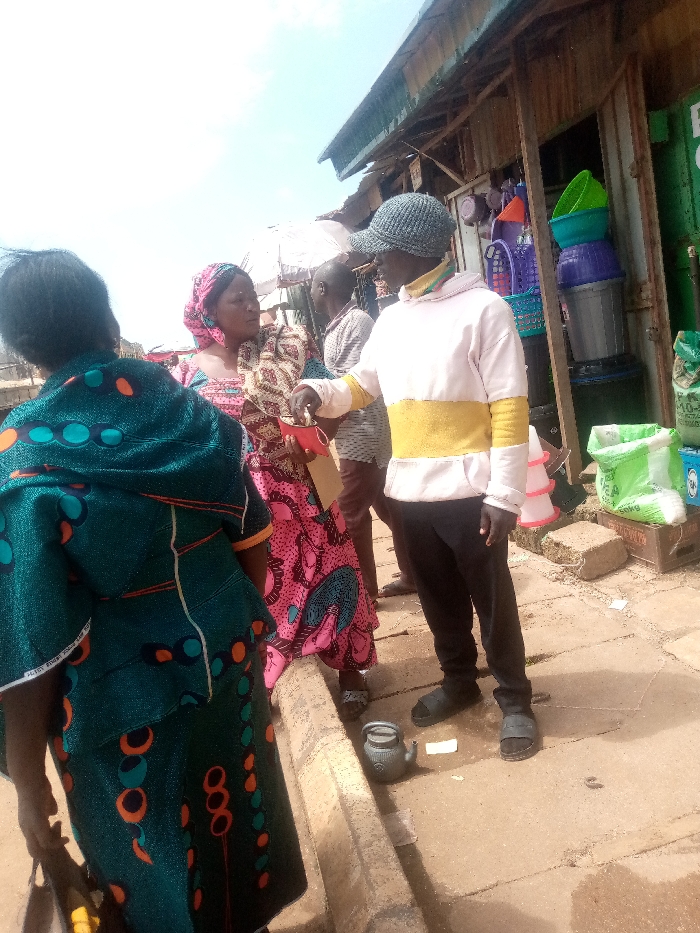 The image depicts a daytime street scene in Kafanchan B, Nigeria, featuring multiple individuals on a paved sidewalk adjacent to a commercial establishment. In the foreground, a person seen from behind wears a short-sleeved, teal garment with orange and teal circular patterns, holding a dark bag in their left hand. To their right, a female individual, facing left, wears a pink and blue patterned dress with a matching head covering, looking towards a male subject. This male subject, positioned center-right, wears a grey knit cap, a long-sleeved hoodie with white sections and a central yellow horizontal stripe, black pants, and black slides. He extends his right hand, holding a red object resembling a wallet or small purse, towards the female in the patterned dress. Behind these individuals, partially obscured, are at least two other people; one male wears a light-colored striped shirt. To the right, a storefront features a corrugated metal facade and an open display of various plastic household items, including green, purple, and blue buckets, bowls, and baskets. Below these, stacked green bags, one marked "50 KG," rest on wooden crates. On the paved ground in front of the subjects, next to a low concrete curb, a small, grey, lidded teapot with a handle is visible. The sky above is bright and mostly clear.